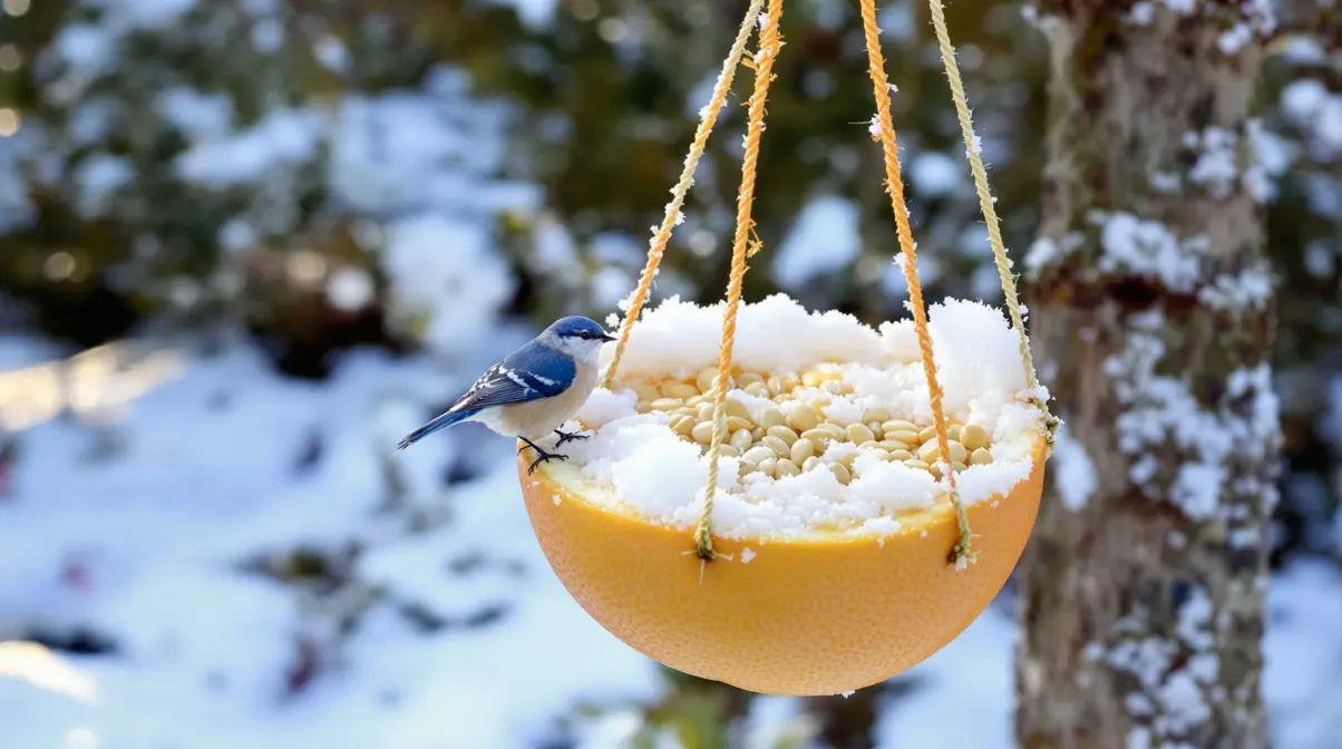 Cette idée est simple, naturelle et terriblement efficace. L’orange sert de support biodégradable. La graisse aux graines apporte l’énergie. Le tout suspendu à une branche devient un véritable aimant à mésanges.