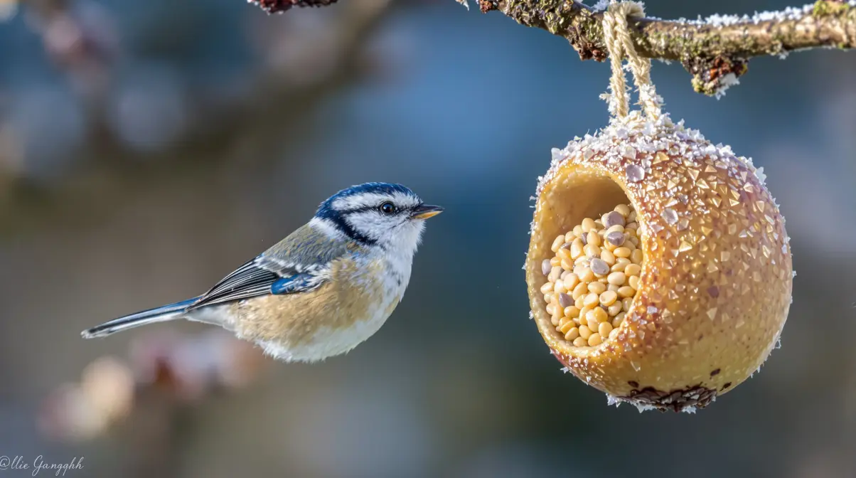 Une fois vos boules de graisse en place, la mangeoire devient vite un petit théâtre. Les mésanges bleues et mésanges charbonnières sont souvent les premières à s’y suspendre, parfois la tête en bas.